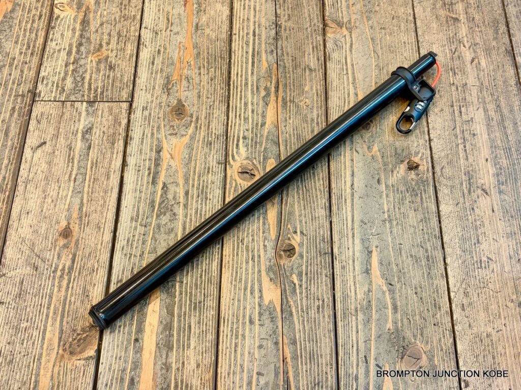 実際に取り付けてみるとカギ本体はサドルの下に収まるようになります。本体部分がフレームとの干渉を防ぐためにシートポストの長さは通常のシートポストから60mm延長された長さになっています。カラーはブラックのみ。