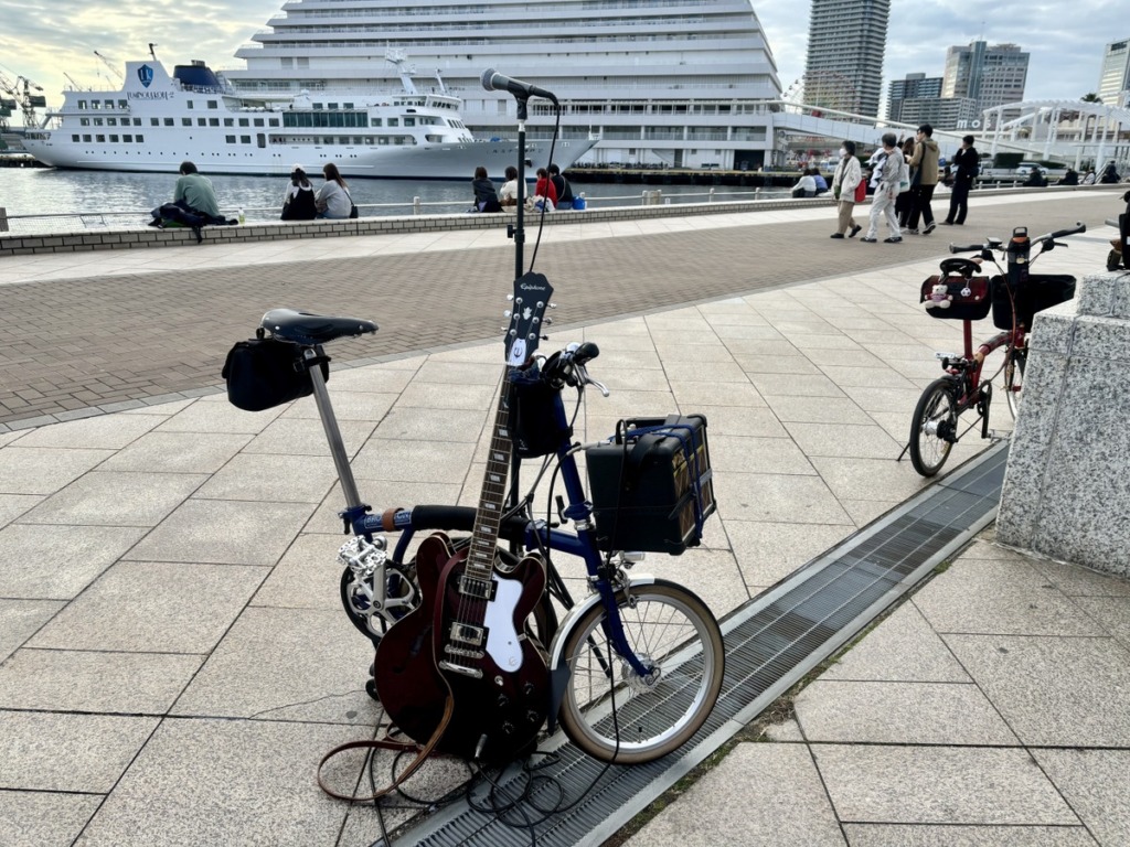 イトウも新たな試みとして、BROMPTONにギターとアンプを積んで移動式ストリートライブ的なことをやってみました。