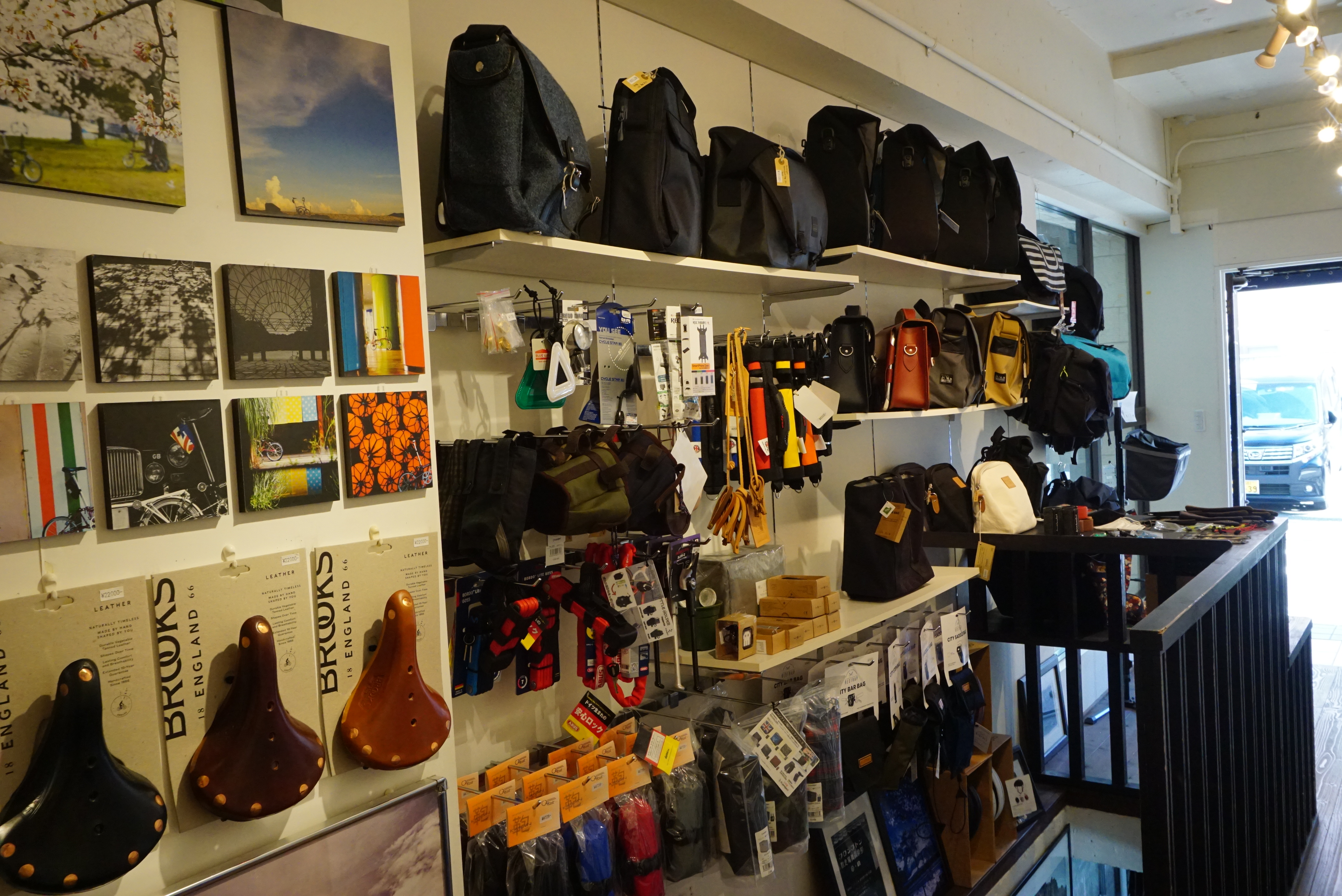 お店は1FとB1Fがあり、1Fは車体と純正部品をメインに展示していて、B1Fはグリップやサドルなど周辺部品を展示しています。 各オプション、補修パーツ、レザーサドルメーカーBROOKSの商品等商品豊富に取り揃えております。 ジャンクション限定商品は西日本では当店のみの取り扱いになります。